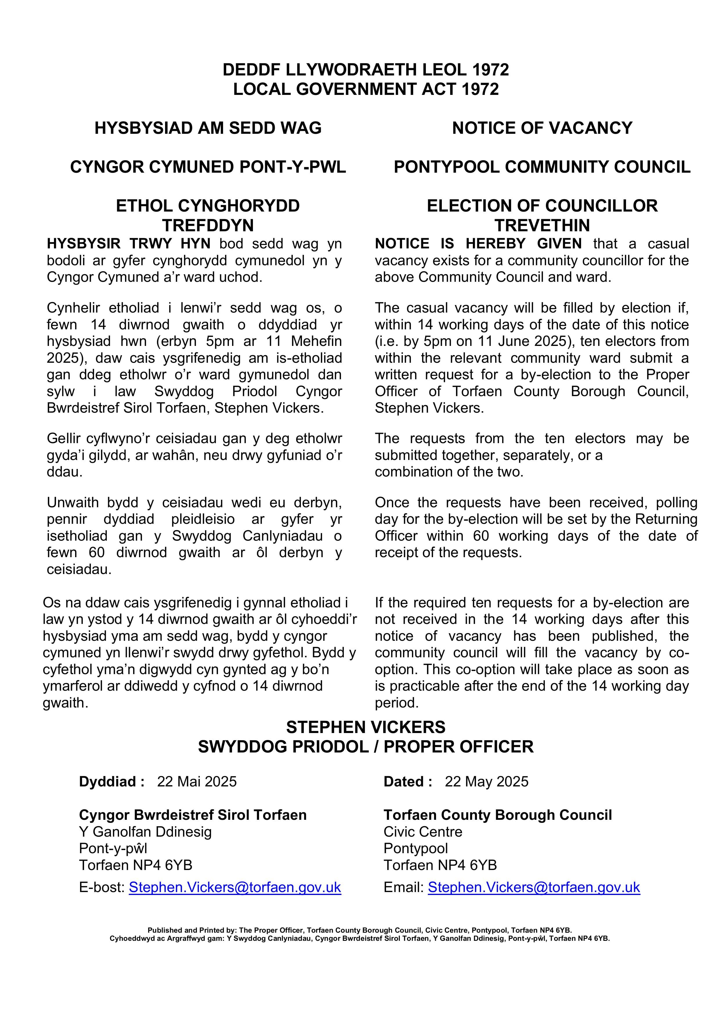 Notice of Vacancy Pontypool Community Council – Trevethin